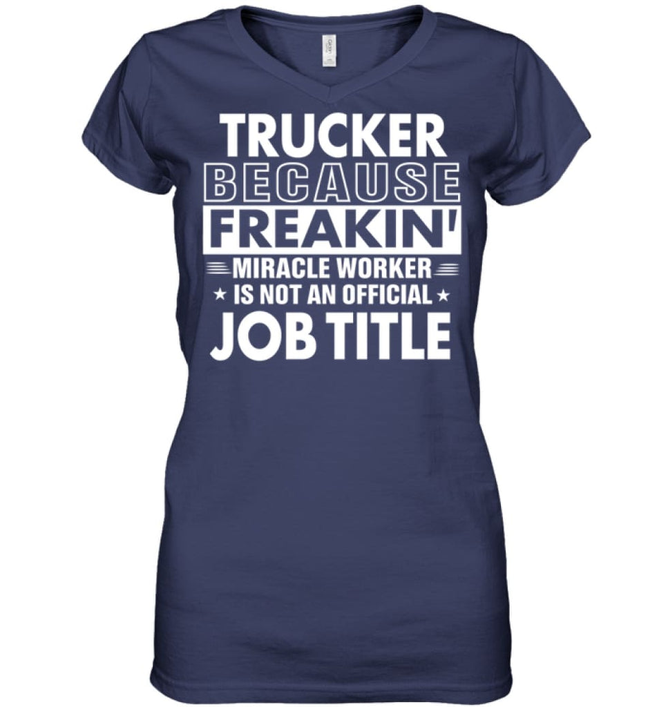 Trucker Because Freakin’ Miracle Worker Job Title Ladies V-Neck - Hanes Women’s Nano-T V-Neck / Navy / S - Apparel
